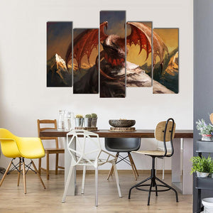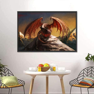 This dramatic canvas features a powerful dragon perched on a rocky peak, its large wings outstretched against a striking landscape. The rich red, orange, and brown hues evoke an epic fantasy atmosphere.