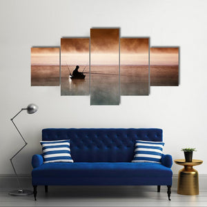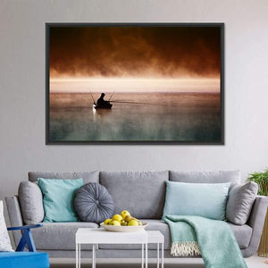 Capture the tranquil beauty of a fisherman in a boat, shrouded in mist on calm waters. This atmospheric landscape artwork brings a serene and peaceful vibe to any space.