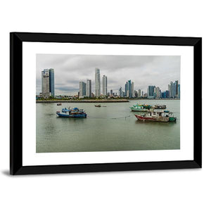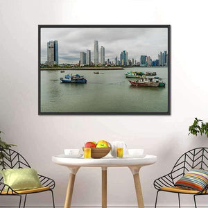 Port With Skyline Of Panama shows a realistic city skyline and waterfront with boats, anchored by tall buildings and a cloudy sky. The muted blue, green and grey palette and layered composition create an overcast, urban-industrial mood that suits modern or industrial interiors.