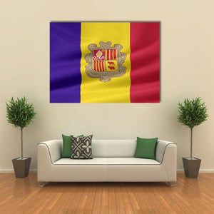 Celebrate the spirit of Andorra with this graphic canvas art featuring the country's flag and coat of arms. The vibrant colors of blue, yellow, red, and gold evoke a sense of patriotism and formality, making it a striking addition to your wall décor.