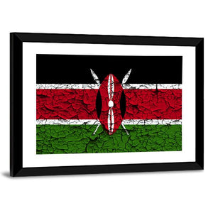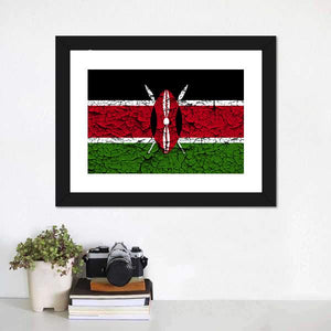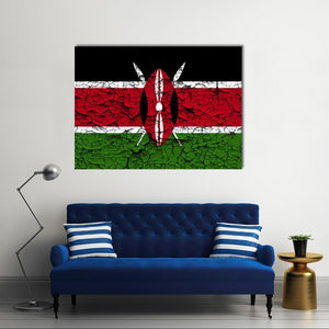 This canvas shows the Kenyan flag with its central shield and crossed spears in a balanced, symmetrical composition. A cracked-paint, distressed texture and the bold black, red, white and green palette give it a patriotic, modern feel that works well in contemporary home settings.