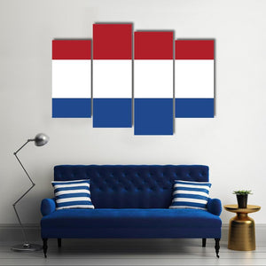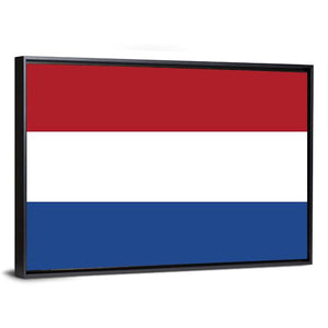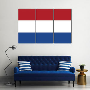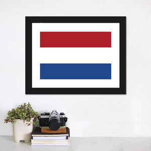 This canvas shows the flag of the Netherlands as three equal horizontal stripes in red, white and blue. The minimalist, modern composition uses clear symmetry for a bold, patriotic feel. It suits modern homes and simple room decor like living rooms or home offices.