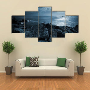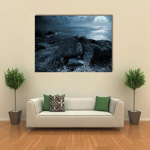 Birds Flying Over Ocean presents a moonlit coastal scene with a flock of birds in flight above rocky shorelines and a distant lighthouse. The blue, white, grey, and black palette creates a dramatic, serene, and mysterious atmosphere. Suits modern and coastal home décor for a calm, cinematic focal point.