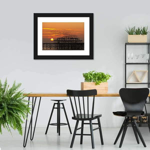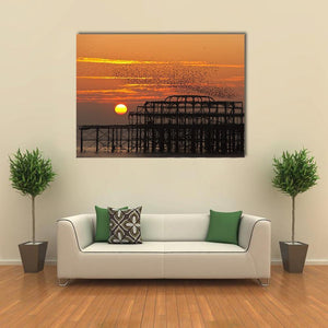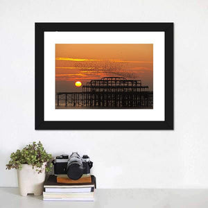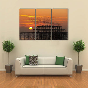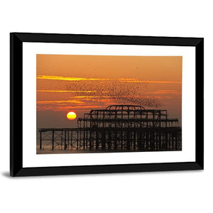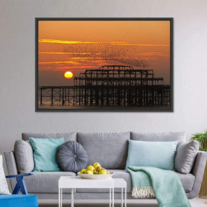 This dramatic canvas features a flock of starlings over a pier at sunset, creating a captivating scene. Its warm palette of orange and yellow hues contrasts beautifully against the rich browns and blacks, making it a striking addition to any space.