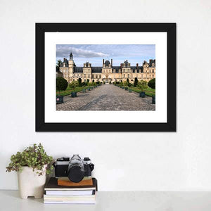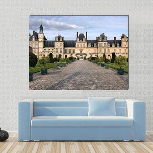 This canvas art features the magnificent Fontainebleau Castle surrounded by a manicured garden and a cobblestone walkway. The elegant palette of beige, gray, green, and blue creates a serene atmosphere, making it a beautiful addition to any space.