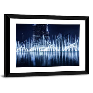 This striking canvas art captures the dynamic beauty of Dubai's dancing fountains at night. With its blue, white, and black palette, it evokes a futuristic and elegant atmosphere, perfect for modern spaces.