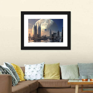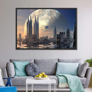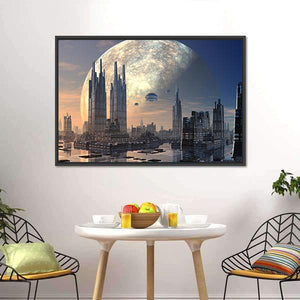 This captivating cityscape showcases a futuristic city with detailed skyscrapers under a large moon, complemented by flying vehicles. The surreal, awe-inspiring composition features a palette of blue, gray, orange, and yellow, creating a layered perspective that invites admiration.