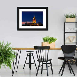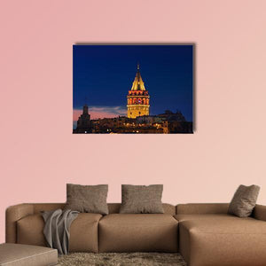 Galata Tower in Istanbul is shown lit against a tranquil evening sky in this photographic cityscape print, with deep blues and warm yellow-orange highlights. The atmospheric, evening mood pairs naturally with modern room decor and brings calm light to a home wall.