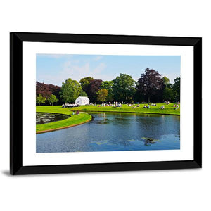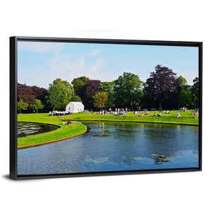 This landscape canvas art captures a serene park scene, featuring a tranquil pond and lush trees alongside people relaxing on the grass. Its peaceful and sunny vibe makes it an inviting addition to any space.