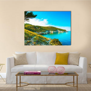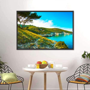 Coastal cliffs, the blue ocean and sunlit green hills appear in a photorealistic seascape that reads serene and vibrant. Bright sunlight, white clouds and a single tree add crisp contrast—suitable for modern rooms or coastal-themed spaces.