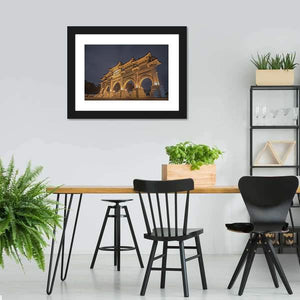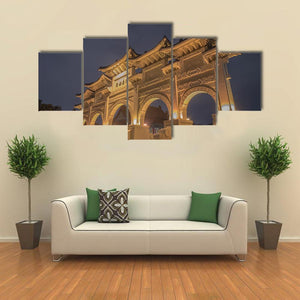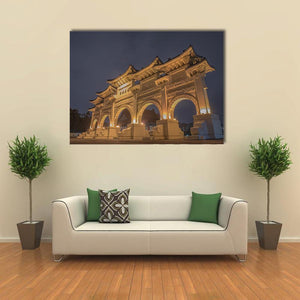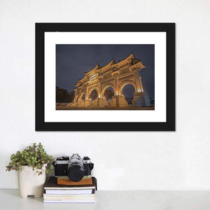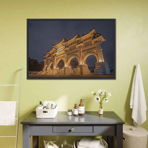 This captivating canvas art features the ornate architecture of the National Taiwan Democracy Memorial Hall, presented in a grand, illuminated nighttime scene. The low angle and wide shot highlight its stunning archway and building details, making it an impressive addition to any cityscape collection.