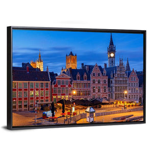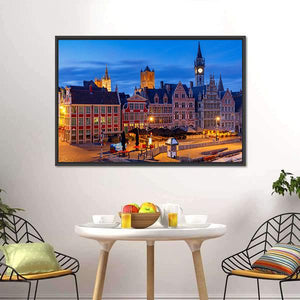 This canvas captures the serene beauty of Gent's historic buildings at dusk, featuring a charming clock tower and a vibrant town square. The rich colors of blue, red, yellow, and brown evoke a warm evening atmosphere that suits both modern and traditional decor.