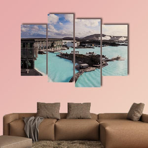 Aerial view of a geothermal pool in Iceland, showing steam rising from turquoise water and a wooden boardwalk beside buildings and distant mountains. Rendered in a modern, photorealistic style with blue, white, gray, and green tones, the image feels serene and exotic and works well in contemporary home or office decor.