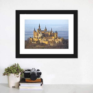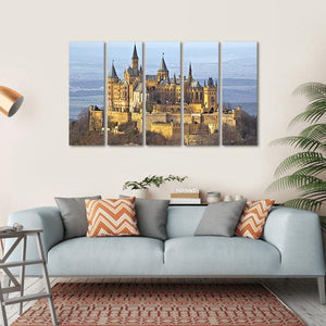 This striking canvas features the grand German castle Hohenzollern, elegantly perched on a hilltop beneath a clear sky. The majestic spires and fortified walls are bathed in a palette of golden yellows and deep blues, creating a historical and awe-inspiring atmosphere.