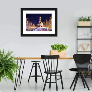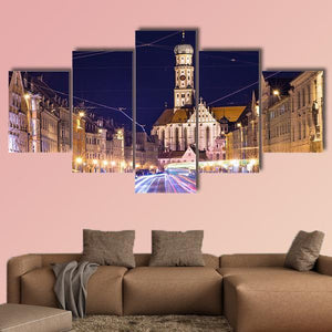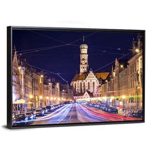 Germany Cityscape Canvas Wall Art shows a city street at night with an ornate church tower and streaking headlights and taillights. The long-exposure look and a palette of dark blue, white, yellow and red give a vibrant, energetic nocturnal mood that works well in modern living rooms and contemporary spaces.