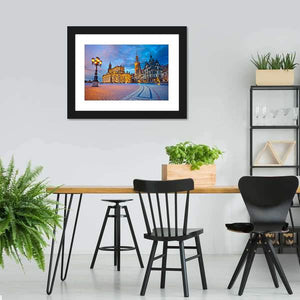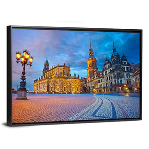 Cityscape On Elbe River Canvas shows a calm, majestic city skyline at dusk with a bridge and river reflecting architectural lights. The realistic composition, in blue, brown, gold and white tones, follows the rule of thirds and suits modern room decor.