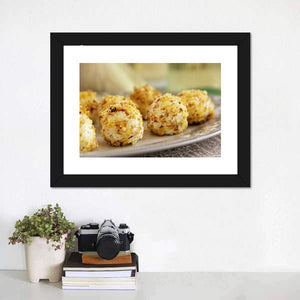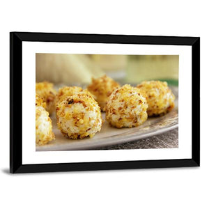 A close-up food photograph of goat cheese balls rolled in crushed nuts on a white plate, with a rustic, homemade feel. Warm neutrals—white, beige, brown and a touch of yellow—give the image an appetizing, cozy mood. It suits kitchens, dining rooms, or casual entertaining spaces.