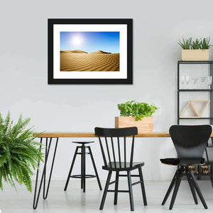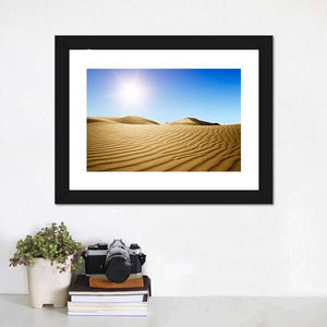 Capture the serene beauty of sunlit sand dunes with this modern canvas wall art. The bright palette of blue, tan, and gold evokes a peaceful desert landscape, perfect for enhancing any room's decor.