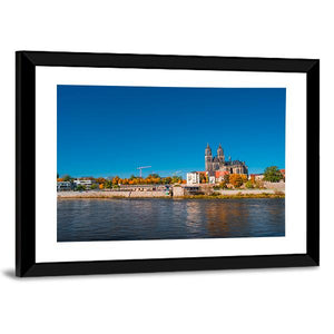 Golden Autumn in Magdeburg shows a realistic riverside view with the cathedral’s twin spires framed by autumn trees in blue, brown, orange and green tones. The rule-of-thirds composition creates a calm, picturesque mood. This canvas works well as living room or hallway wall decor and complements modern interiors.