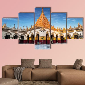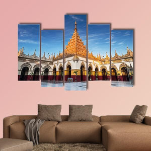 This canvas captures the Mahamuni Buddha Temple courtyard and pagoda with a central, photorealistic focus. Ornate spires, an arched colonnade, and geometric floor patterns appear in gold, white, blue, and red, giving the scene a serene, majestic mood. It suits modern homes and quiet living or meditation spaces as an architectural focal point.