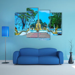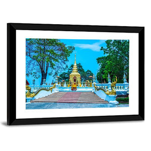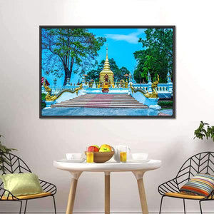 A realistic landscape canvas showing the Prathat Doi Wao temple straight on, with a golden stupa, ornate railings, a staircase and trees beneath a vibrant blue sky. The scene feels serene and majestic and suits modern home decor.