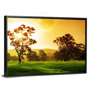 A realistic rural landscape of trees, a wide field and rolling hills at sunset, with sunlight shining through the trees. Warm green, yellow and orange tones create a serene, peaceful atmosphere that suits modern or nature-inspired rooms.