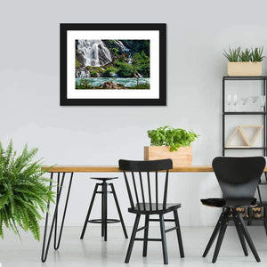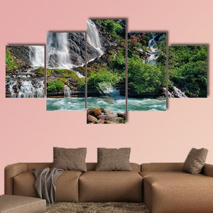 Schleierfall Waterfall Canvas Wall Art depicts a multi-tiered waterfall cascading over rocky slopes into a turbulent river, creating a serene, powerful natural scene with dense green vegetation. Rendered in a realistic landscape palette of white, blue, green, gray and brown, the print captures motion and atmosphere. It fits modern home decor as nature-inspired wall art for living rooms, bedrooms, or hallways.
