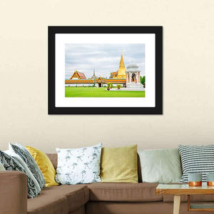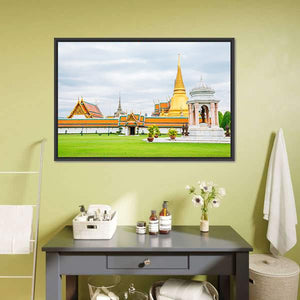 A realistic landscape of the Grand Palace in Bangkok, this canvas shows the temple complex with a golden pagoda, ornate temple roofs, a manicured green lawn and a partially cloudy sky. The daytime scene and gold-and-green palette create a serene, grand mood that suits modern living spaces and room decor.