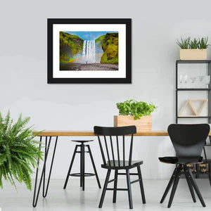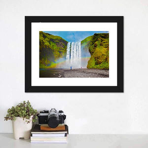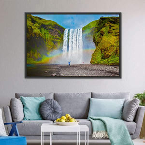 A photorealistic canvas of a grand Iceland waterfall, with mountains, mist and a rainbow arching through the spray. A person with arms raised and a smaller figure in the distance add scale and a human touch. The greens, blues and soft pinks create a majestic, vibrant atmosphere that suits modern homes and nature-focused room decor.