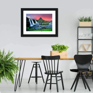 Great Kirkjufellsfoss Waterfall Canvas depicts a mountain waterfall with a lone person in a blue jacket at sunset. The long-exposure water and soft blue, green, pink and grey tones create a serene, awe-inspiring mood. Suits modern or nature-focused rooms.