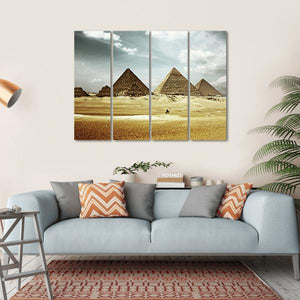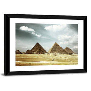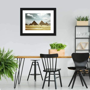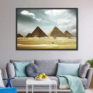 This captivating canvas features the iconic Great Pyramids surrounded by the vast desert, evoking a sense of historic grandeur. A lone camel rider contrasts against the dramatic sky, making it a striking addition to any wall.