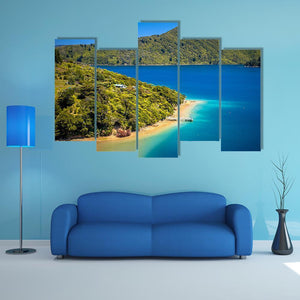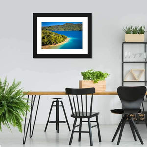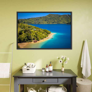 A photographic landscape of green forest meeting clear blue water, with boats docked at a pier and lush hills along the coastline. The rule-of-thirds composition gives a calm, tropical vacation mood. Suited to modern room decor like living rooms or bedrooms for a peaceful focal point.