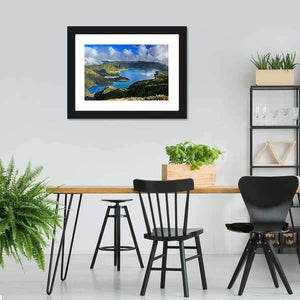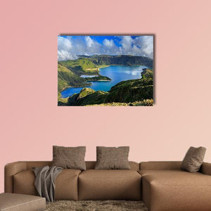 Experience the serene beauty of San Miguel Island in the Azores with this landscape canvas featuring lush green hills and tranquil blue waters. The overhead perspective captures the expansive volcanic landscape, inviting a connection to nature and peace in your space.