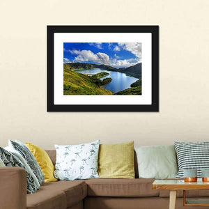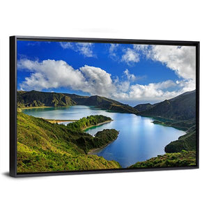 This canvas print captures an aerial, wide-shot landscape of a caldera lake with multiple inlets, lush green hillsides, distant mountains and cumulus clouds. The photorealistic scene reads serene and majestic with a cool blue-green palette and clear daytime light. It works well in modern, nature-focused rooms seeking a tranquil focal piece.