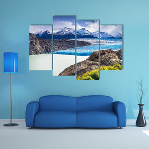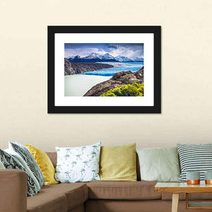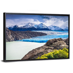 Grey Glacier in Chile captures a blue-ice glacier beside a lake, framed by snow-capped mountains and a rocky, green-vegetated foreground. The composition uses depth and a rule-of-thirds balance to create a majestic, serene, and slightly dramatic mood. A natural fit for modern living rooms or house spaces that favor nature-inspired art.