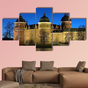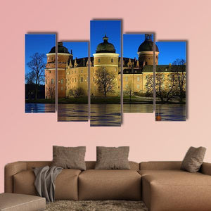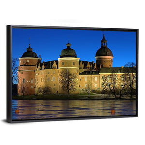 A realistic night view of Gripsholm Castle in Sweden, showing domed towers, illuminated windows, frozen water and surrounding trees. The blue, yellow and brown palette gives a serene, historic mood—an understated wall piece that suits modern interiors and wall decor.
