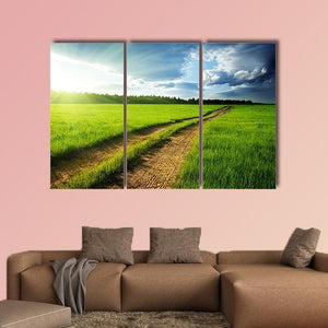 A sunlit dirt road cuts through a green field beneath a blue sky, with sunbeams piercing the clouds. The scene reads as peaceful and hopeful, painted in realistic, vibrant tones. It suits modern interiors and nature-inspired spaces as a calm, uplifting focal point.