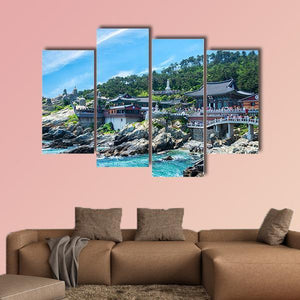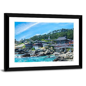 Haedong Yonggungsa Temple Canvas Wall Art shows the temple perched on a rocky coastline with clear blue water, trees, and wispy clouds for a serene, picturesque scene. Rendered photorealistically in blue, green, gray, and white tones with a rule-of-thirds composition, it fits modern or coastal-inspired rooms and nature-focused décor.