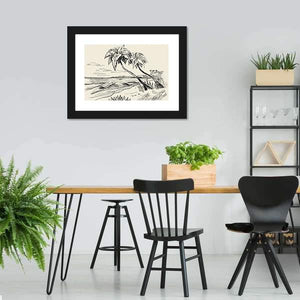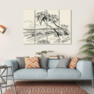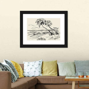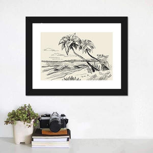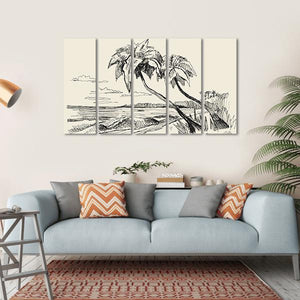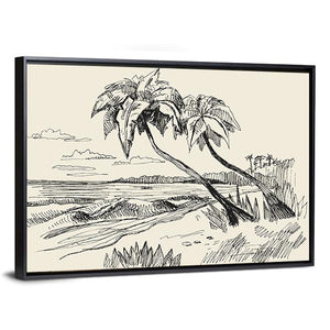 This canvas art features two leaning palm trees against a serene beach and ocean backdrop. With a vintage, sketchy style and a calming black, white, and beige palette, it brings a tropical feel to any space.