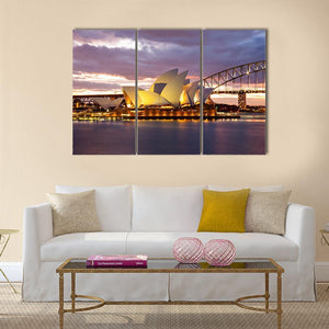 Sydney Opera House At Dusk presents the Opera House and Sydney Harbour Bridge in a photorealistic dusk cityscape, with lights glowing across the harbor. The purple, orange and blue palette creates a serene, iconic mood. Suits modern living rooms and offices seeking a calm architectural focal point.