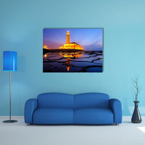 This canvas art features the majestic Hassan II Mosque illuminated at night, reflecting beautifully on the ocean's cracked surface. Its tranquil and peaceful mood makes it a stunning addition to any room.
