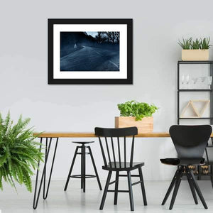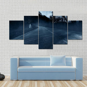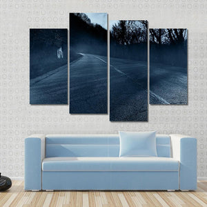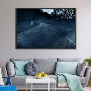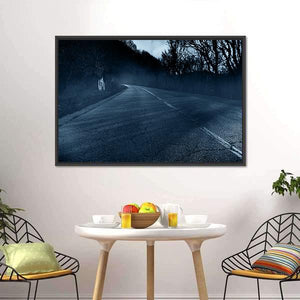 This eerie landscape features a cracked asphalt road shrouded in fog and framed by bare tree branches. The dark blue, grey, and white palette enhances the mysterious and desolate atmosphere, making it a striking piece for those who appreciate dramatic art.