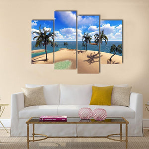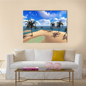 A realistic Hawaiian beach scene with palm trees, ocean, bright sky and soft cloud shadows that creates a serene, idyllic tropical mood. The calm blue, green and tan palette suits modern rooms—living rooms, bedrooms or beach houses—looking for relaxed nature wall decor.