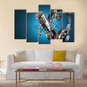 Headphones On Microphone Stand Canvas shows a studio microphone with over-ear headphones against a blue gradient background. The modern, graphic composition and cool blue, silver, and black palette create a professional, technical mood that fits music rooms, studios, and contemporary interiors.