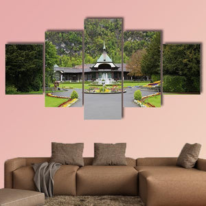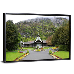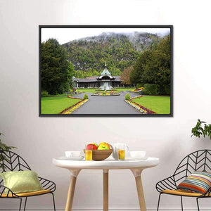 Casino Kursaal in Interlaken shows a grand building and fountain at the end of a tree-lined driveway, with flower beds leading toward a distinctive roof and misty, tree-covered mountains beyond. The realistic landscape uses greens, browns, whites and grays to create a peaceful, scenic mood that suits modern living spaces.