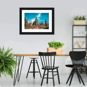 A photo-realistic wide shot of temple ruins in Ayutthaya beneath a clear blue sky. Blue, brown and green tones give the image a historic, peaceful mood that suits modern home decor and makes a calm focal point in a living room.