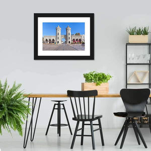 City Gate In Potsdam Canvas Wall Art depicts the historic gate in Potsdam with its two prominent towers, arched passageway, cobblestone street, and tram tracks. The realistic, symmetrical cityscape carries a sunny, grand mood in a palette of gray, blue, brown, and red, with outdoor seating visible under the arches. It suits modern room decor and works well as a calm, architectural focal point.
