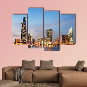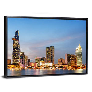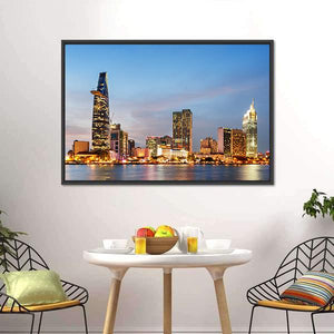 Ho Chi Minh City skyline at dusk, shown with a river and buildings lit up and reflecting on the water. The composition features a prominent skyscraper on the left and a blue-and-gold palette that feels urban and modern. Suited to modern living rooms or offices as contemporary wall decor.