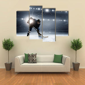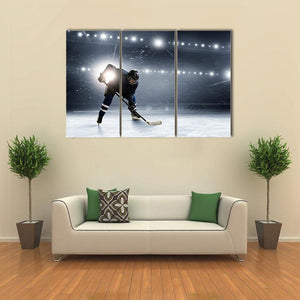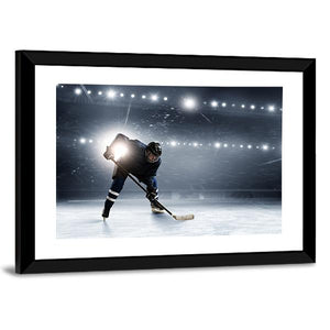 This canvas art features an intense hockey player in action at an ice rink, illuminated by bright stadium lights. The dynamic composition and cool color palette of blue, grey, and white create a dramatic atmosphere, perfect for sports enthusiasts.