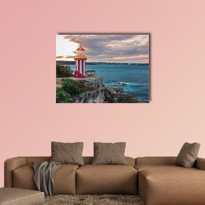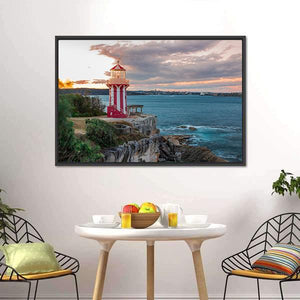 Hornby Lighthouse Sydney Canvas Wall Art depicts a red-and-white striped lighthouse on rocky cliffs beside the ocean. The realistic landscape captures a cloudy, orange-tinged sunset sky and a serene yet dramatic mood. Suited to coastal or modern room decor, it brings seaside character to living spaces.